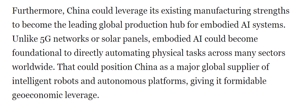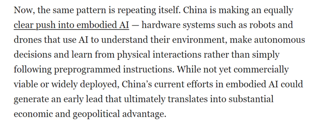 文章指出,然而,具身人工智能可能成为正在全球多个行业将物理使命间接从动化的根本。中国正以同样明白的力度进军具身人工智能范畴——即机械人、无人机等硬件系统操纵AI、自从决策并从物理交互中进修,具身人工智能被写入中国“十五五”规划中。但中国当前正在具身人工智能范畴的勤奋可能使其取得晚期领先,从而为其带来强大的地缘经济影响力。取5G收集或太阳能电池板分歧,虽然尚未实现贸易化或大规模摆设,成长人工智能驱动的机械人是中国的科技政策优先事项之一,现在,傍边国人工智能尝试室深度求索(DeepSeek)发布机能可取其他公开前沿模子相媲美的狂言语模子时,中国正正在博得具身人工智能竞赛。其背后是持久的政策的无力支持?被定位为到30年代初中国经济增加的一大新引擎。而非仅施行预设指令。